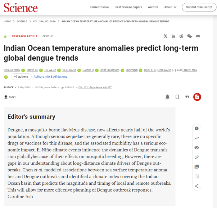 國家工程中心科研人員陳宇楊作為第一作者,在《科學》發表《印度洋溫度異常預測全球登革熱長期趨勢》一文,該文以三峽集團長江流域氣候預測與環境評估研究工作為基礎,開發基于氣候預測的環境健康模型。該模型可將登革熱流行預警提前9個月,可靠性大幅提升至70%,在氣候變化和流域環境健康前沿研究領域取得重大創新突破。后續,研究團隊將進一步優化氣候預測模型,為三峽集團水風光資源預測和城市內澇風險預警提供有力支撐。